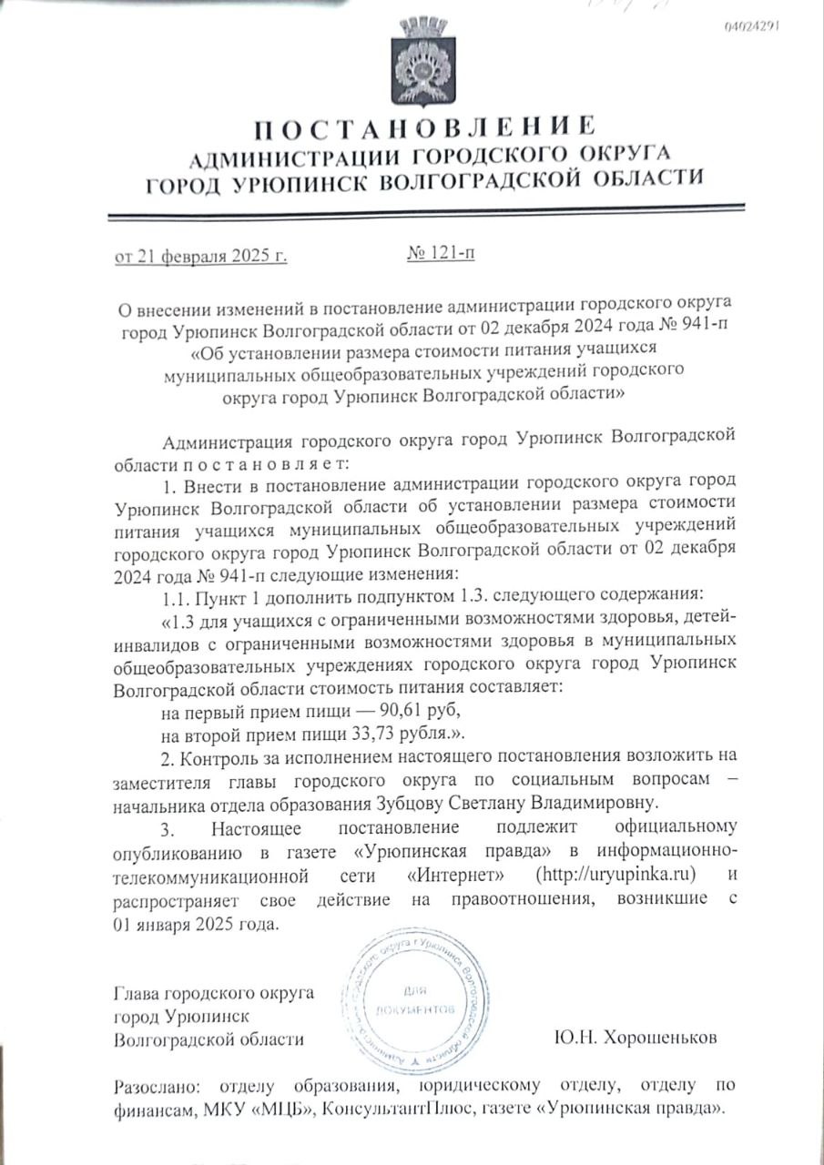 - Постановление от 20.02.2025г. 118 -п "Об утверждении Положения об обеспечении горячим питанием учащихся в муниципальных общеобразовательных организациях городского округа город Урюпинск Волгоградской области"